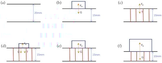 Principle of sensor compression operation: (a) Initial 20 mm-thick sponge. (b) Placing object a to compress sponge by 5 mm. (c) Force analysis when sponge is fixed at 15 mm through sewing. (d–f) Force analysis when placing objects b, c, and d, respectively.