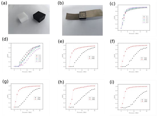 A series of tests were conducted to demonstrate the characteristics of the CS/CNT/MS pressure sensor. Figure 4a,b illustrates the schematics of the MS before/after the impregnation and sewing process. As shown in Figure 4c–e, we measured the variation in the relative resistance of the 20 mm-thick and compressed 15 mm-thick MS under applied pressure, evaluated across different concentration conditions. By comparing Figure 4c,d, a significant variation in sensor sensitivity is clearly observed. The sensitivity of the sensor is defined as follows: