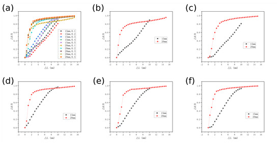 Through the systematic study of the pre-compression processing effects on the strain-resistance relationship of the sensor (Figure 6), it was observed that the strain-resistance response of the sensor underwent significant changes after compressed encapsulation. Figure 6b–f illustrate the resistance responses at concentrations ranging from 0.1 to 0.5; the 20 mm sensor in its original state exhibited a pronounced nonlinear strain-resistance response. This behavior can be decomposed into two distinct stages. Rapid Response Region (strain < 12.5%): This corresponded to the rapid closure of initial pores, during which conductive pathways exhibited exponential proliferation. This resulted in a resistance change rate of