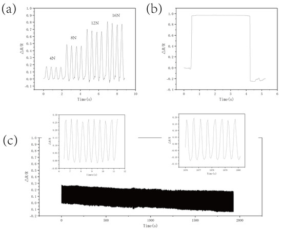 The experimental data (Figure 7a) show that the CS/CNT/MS sensor exhibited gradient resistance responses under pressures of 4 N, 8 N, 12 N, and 16 N.