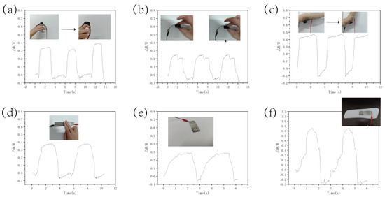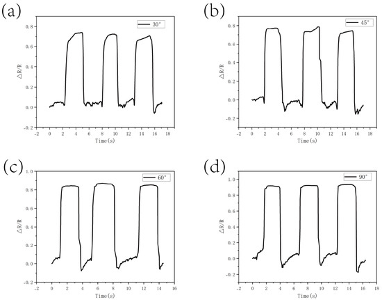 Figure 11 demonstrates the resistance response of the CS/CNT/MS pressure sensor at bending at different angles. The experimental results indicate that the resistance change rate (R/R) reached 0.7 at a small angle of 30° (Figure 11a), likely due to the rapid closure of pore structures in the melamine sponge under slight bending. This structural change triggered an exponential proliferation of conductive pathways, causing a sharp drop in resistance. As the bending angle increased to 45° (Figure 11b) and 60° (Figure 11c), the resistance change rate rose to 0.8, demonstrating the sensor’s sensitive response to angular variations. When the sensor was fully folded at 90° (Figure 11d), the resistance change rate reached 0.9. At this extreme angle, the sponge skeleton underwent significant compression, leading to partial pore closure and increased contact pressure at the CNT/CS interface. This exacerbated the reconfiguration of conductive pathways and abrupt resistance transitions. Notably, the sensor maintained continuous conductivity without exhibiting circuit breaks despite these extreme deformations.