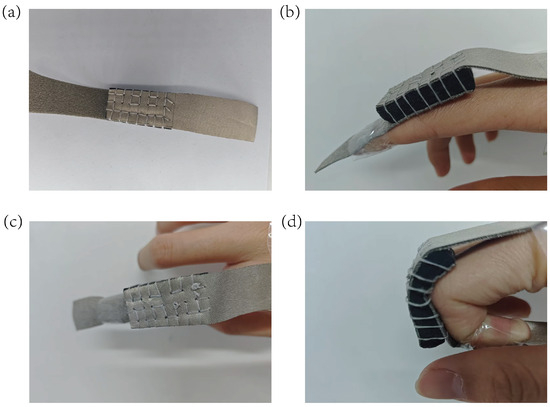 The redesigned structure achieved alignment with human joint kinematic characteristics (Figure 10b,c) by reducing the thickness to 10 mm and optimizing the aspect ratio (L/W = 2:1): the 20 mm width matched the phalangeal joint width of the wearer, ensuring stable adhesion; the core functional layer of the 3D conductive network (CS/CNT/MS) was fully retained (Figure 10d), enabling multi-angle bending tests without compromising the material’s intrinsic electrical properties.