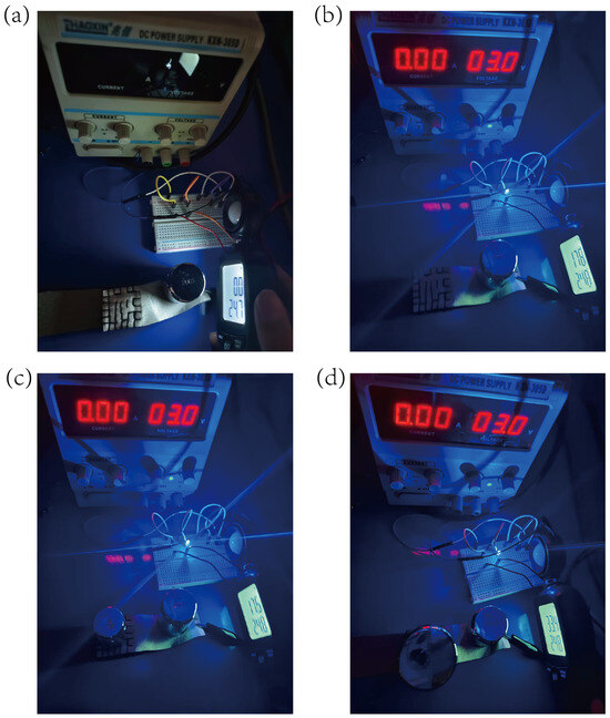 Brightness test of led: (a) no pressure and no voltage applied in a dark environment; (b) a 3 V voltage applied; (c) a 100 g load placed on the sponge; (d) a 500 g load placed on the sponge.