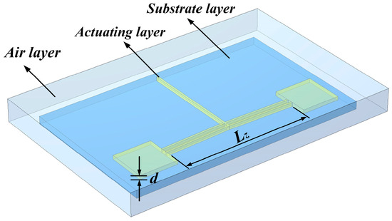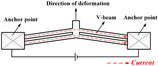 The electrothermal actuator mainly uses the material’s thermal expansion effect. The V-shaped electrothermal actuator consists of two end anchor points and a V-shaped actuate beam [17]. The structure is shown schematically in Figure 1. When a voltage is applied at both ends of the anchor point, current flows along the V-beam, generating Joule heat through the beam’s internal structure, causing the actuator to expand thermally.