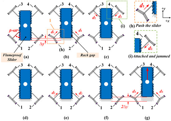 The working process of the multi-electrothermal co-actuation device. (a) Initial state; (b) actuators 1 and 2 push the slider to move one sub-step displacement; (c) actuator 3 and actuator 4 fix the position of the slider; (d) the levers of actuators 1 and 2 return to the initial position; (e) the levers of actuators 1 and 2 only contact the slider; (f) actuators 3 and 4 are powered off and move back to the initial position; (g) actuators 1 and 2 push the flameproof slider again to output another sub-step displacement; (h) the detail of actuators 1 and 2 pushing the slider; and (i) the detail of actuators 3 and 4 jamming the slider.