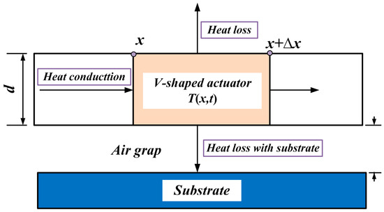 The temperature distribution of the actuator is simplified to a one-dimensional steady-state problem [18]. By combining the principle of energy conservation, a transient mathematical model for the V-shaped electrothermal actuator can be derived as follows: