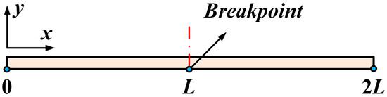 The simplified model shown in Figure 4 indicates a breakpoint between the intervals [0, L] and [L, 2L], corresponding to the electrothermal actuator’s center point. The temperature distribution function at this discontinuity is second-order derivable, which leads to the relationship given in: