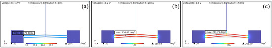 Temperature distribution of the V-shaped actuator at different times with 1.2 V voltage: (a) initial state; (b) t = 20 ms; and (c) t = 50 ms.
