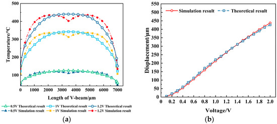 Figure 8a displays the electrothermal actuator’s theory and simulation temperature distribution in the steady state under different voltages. The theory temperature distribution curve is approximately a quadratic parabolic curve, while the simulation results exhibit an “M”-shaped temperature distribution curve; there is some error between them. As the voltage gets lower and closer to the steady state, the error is smaller and the temperature distribution is more uniform.