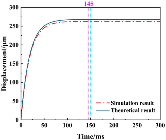 The response time of the V-shaped electrothermal actuator under the simulation results is about 150 ms, and the response time under the theoretical results is approximately 145 ms, with the theoretical value being slightly lower than the simulation value. This discrepancy arises because the mechanical response time is ignored in the theoretical analysis and the thermal response time is directly taken as the overall system response time. The error between them is about 3.45%, which is within the allowable error range.