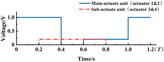 Based on the performance analysis of a single V-shaped actuator in Section 3.2, the voltage for the main-actuate unit (actuators 1 and 2) is set to U1 = 1.0 V, while the voltage of the sub-actuate unit (actuators 3 and 4) is given as U2 = 0.2 V. One working time step is set to 200 ms, where the voltage pulse within one cycle of each actuator is obtained, as shown in Figure 10.