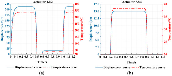The displacement and temperature curve of the actuators: (a) the main-actuate unit; and (b) the sub-actuate unit.