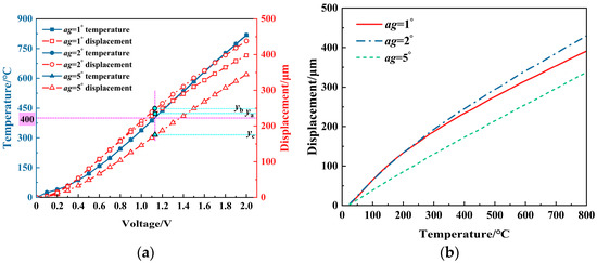The effect of the title angle (ag) on the displacement of the V-shaped electrothermal actuator: (a) under different voltages; and (b) under different temperatures.