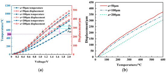 The effect of the V-beam width (a) on the displacement of the V-shaped electrothermal actuator: (a) under different voltages; and (b) under different temperatures.