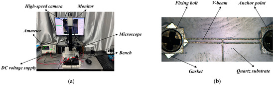 The experimental preparation of the electrothermal micro-device: (a) the experimental platform; and (b) the prototype of the V-shaped electrothermal actuator.