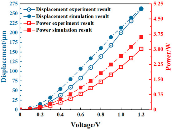 Figure 19 shows the comparison curves between the experimental results and the simulation results. The results indicate that both the displacement and the power increase nonlinearly with the voltage. The experimental results are basically consistent with the trend observed under simulation. The experimental values are slightly smaller than the simulation values, and the error is within the allowable range.