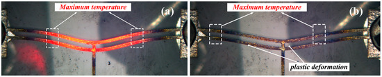 As shown in Figure 20a, when a 2.0 V voltage is applied to the electrothermal actuator, the highest temperature occurs in the V-shaped actuator beam arm, which is completely consistent with the simulation results in Section 3.2, thereby validating the accuracy of the electrothermal actuator’s temperature distribution theoretical model.