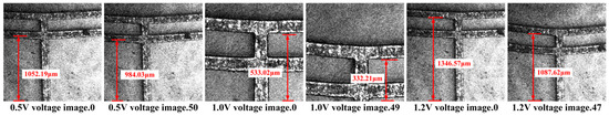 The high-speed camera’s frame rate is 300 frames per second. By calculating the number of frames, the dynamic response time experimental results for the electrothermal actuator at different voltages are 166.5 ms (0.5 V), 163.17 ms (1.0V), and 156.51 ms (1.2 V), respectively. When reaching the steady state, the displacements are 68.16 μm (0.5 V), 200.81 μm (1.0 V), and 258.95 μm (1.2 V), which are in good agreement with those measured under the steady state.