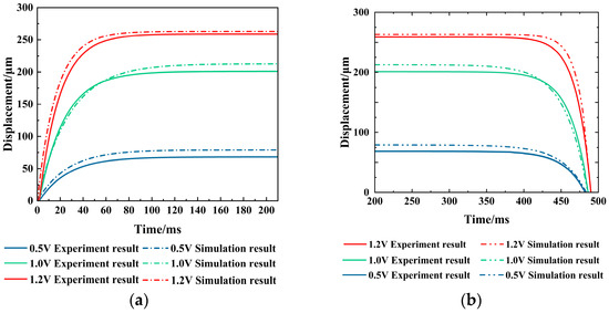 The dynamic response of the V-shaped electrothermal actuator under different voltages: (a) the dynamic of rising to a steady state; and (b) the dynamics of returning to the initial state.