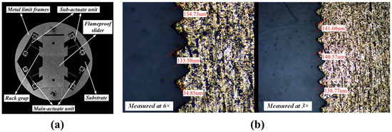 Based on the experimental equipment shown in Figure 19, an additional power supply is required for the sub-actuate unit in this experiment. The prototype needs to be assembled, as shown in Figure 23. Due to the small size of the components, the assembly process is carried out under a microscope. The electrothermal actuator with a pusher has holes punched at both ends of the anchor points, which are connected and fixed to the substrate using screws with corresponding positioning holes on the substrate, and a metal limit frame is used to limit the left and right movement of the flameproof slider, which is also fixed to the substrate through the positioning holes.