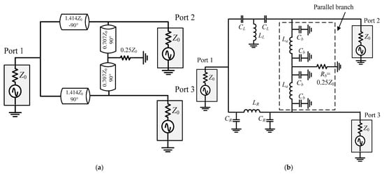 Schematic of the Wilkinson-type balun with (a) distributed transmission lines form and (b) lumped transmission lines form.