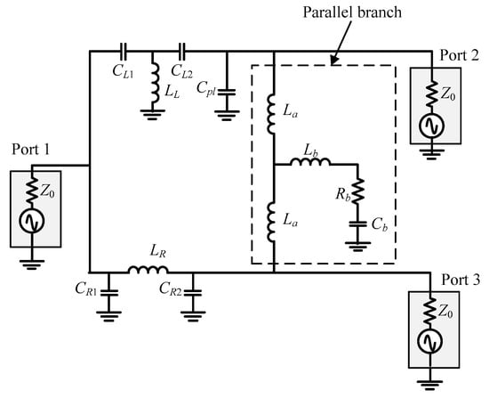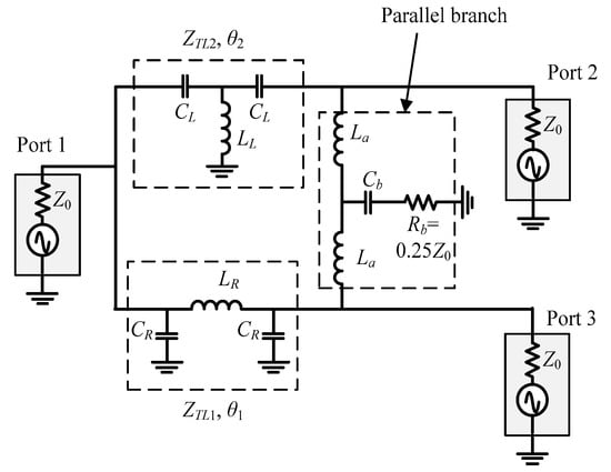 To reduce the circuit size, two methods can be applied: (1) adjust the electrical length of the lumped-transmission line with a smaller inductor and/or (2) replace lumped transmission lines at the parallel branch with fewer components. In this paper, a new topology with these techniques was studied. The schematic is shown in Figure 2.