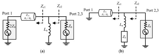 where is the electrical length of the right-handed lumped-transmission line, while is the electrical length of the left-handed one. The characteristic impedance of the lumped transmission lines and the lumped components can be found by even- and odd-mode analysis, shown in Figure 3.