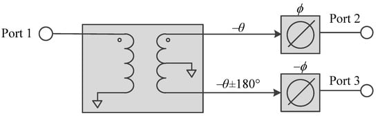 The differential phase coupler consists of the balun and the phase shifters, as shown in Figure 5. Ideally, the phase shifters shown are lumped transmission lines with the same characteristic impedance as the port impedance and have the electrical length, ϕ. To achieve an output differential phase, , the relationship between the output differential phase and the electrical length of the phase shifters, , is