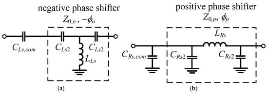Schematics for (a) negative phase shifter and (b) positive phase shifter with compensation capacitors.
