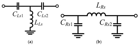 In implementation, the output impedances of the balun were not perfectly equal to the port impedance due to the parasitic inductance from the connecting line in the layout. Compensation capacitors can be added before the phase shifter circuits, as shown in Figure 6. The phase shifter circuits are implemented by lumped transmission line circuits with Figure 6a for negative phase shift and Figure 6b for positive phase shift. The characteristic impedance of the line and the electrical length are shown in (7)–(10), where and are the characteristic impedance and negative phase of the phase shifter, while and are the characteristic impedance and positive phase of the phase shifters. In the design, the characteristic impedance of the lines is chosen to be the same as those of the port impedance.