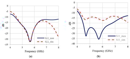 The lumped components were adjusted to account for the layout parasitics. The design parameters at 6 GHz became CL1 = 1.53 pF, CL2 = 0.385 pF, LL = 1.635 nH, CR1 = 0.178 pF, CR2 = 0.98 pF, LR = 1.54 nH, La = 0.81 nH, Lb = 0.29 nH, Cb = 1.7 pF, and Rb = 7.2 Ω. The inductors were estimated to have Q ≈ 20. The resulting simulation and measurement are shown in Figure 9. In the figure, the measured data were added with ‘_mea’ in the legend, while the simulated data were added with ‘_sim’.