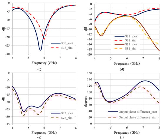 Results from layout simulation and measurement. (a) |S11| (b) |S22| (c) |S33| (d) |S21|, |S31| (e) |S23| (f) output phase difference.