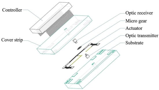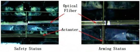 Zhou Xiaodong from the Army Engineering University of the People’s Liberation Army of China proposed a laser-ignited MEMS S&A device in 2017 [16], as shown in Figure 6. Two optical fibers are misplaced in the mechanism. When the device receives the execution signal, the silicon-based electric S&A device starts to operate, completing the mutual alignment of the two optical fibers. At this time, laser energy can be transmitted normally and ignite the next level of energetic material. The device can achieve mutual conversion between safety and release states within 19 ms, while the overall size is less than 10 mm × 10 mm × 0.5 mm.