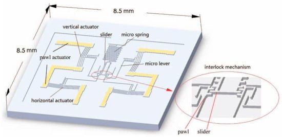 Hu Tengjiang from Xi’an Jiaotong University proposed a large displaced MEMS S&A device in 2019 [17], as shown in Figure 7. Two claws that can drive the slider separately are symmetrically placed in the mechanism, consisting of a horizontal electric S&A device and a vertical electric S&A device. The horizontal electric S&A device is used to pull the slider. The vertical electric S&A device is used to achieve engagement and separation between the pawl and the slider. The teeth on the pawl and slider can not only achieve interlocking function, but also achieve linear displacement during operation. The MEMS S&A device switches between safety and release states by driving the partition to achieve linear displacement. The size of the electrically driven MEMS S&A device is 8.5 mm × 8.5 mm × 0.8 mm.