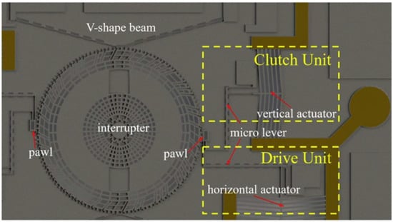 Fang Kuang from the Institute of Chemical Materials at the Chinese Academy of Engineering Physics proposed a MEMS S&A device with encryption function driven by a V-shaped electric micro S&A device in 2020 [18], as shown in Figure 8. The control unit of the S&A device consists of a vertical electric S&A device and a micro-lever, used to control the separation and engagement between the pawl and the partition plate. The driving unit consists of a horizontal electric S&A device and a micro-lever, which is used to pull the partition plate to rotate on the substrate. The V-shaped beam can be wedged into the tooth groove between the teeth on the partition plate to fix the position of the partition plate. The teeth of the turntable are divided into normal teeth and trap teeth, and the pawl is equipped with a unique locking groove. When an incorrect decoding voltage is input, it can form a bite lock with the spring in the trap teeth, and the entire device is locked. The safety mechanism switches between safety and release states by controlling the rotation of the partition plate through a pawl. The overall size of the device is 13.4 mm × 9.3 mm × 0.454 mm.