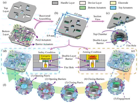 Metal/silicon composite barrier. (a) Two layers structure; (b) The S&A device; (c) The section view; (d) The safety condition; (e) The arming condition; (f) Operation process of the bistable mechanism. Reprinted from Ref. [21].