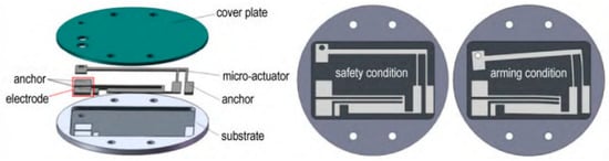 - Hu, T.J.; Ren, W.; Zhao, Y.; Xue, Y. The research on actuation performance of MEMS safety and arming device with interlock mechanism. Micromachines 2019, 10, 76. [Google Scholar] [CrossRef]