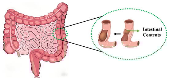 The human bowel sounds primarily originate from intestinal peristalsis, which refers to the symmetrical contraction and relaxation of intestinal muscles that propel intestinal contents, generating characteristic acoustic signals during this process. These sounds propagate through the gastrointestinal system in a wave-like pattern []. Based on the bowel sound model proposed by Du [], intestinal peristalsis is caused by the contraction of intestinal muscles, which compress the intestinal contents into a small segment of the intestine, as illustrated in Figure 1. The fundamental component of bowel sounds is the individual wave, representing the compression of intestinal contents under luminal contraction forces, which reflects the dynamic characteristics of intestinal motility. The physiological mechanism involves cyclic muscular activity: intestinal smooth muscles generate contractile forces that narrow the lumen and compress the contents, followed by muscle relaxation allowing lumen recovery, before initiating a new contraction phase to complete the motility cycle. Each movement cycle consists of two distinct phases—contraction and relaxation—that collectively enable the directional propulsion of contents through the digestive tract. The resonant frequency of bowel sounds can be calculated using Equation (1):