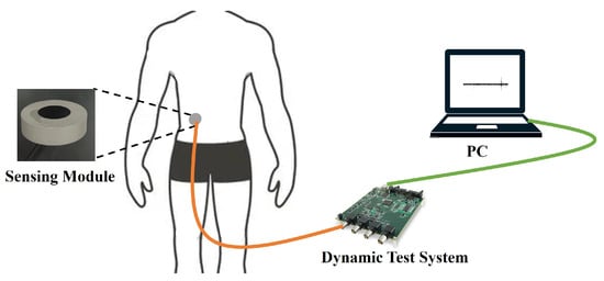 The monitoring system in this study is structured as shown in Figure 2, consisting of both hardware and software components. The hardware section includes a sensing module, a data acquisition card (MCC USB-2020), and a computer terminal (PC), which work together to achieve the acquisition and transmission of bowel sound signals. The software system utilizes a MATLAB-based graphical user interface (GUI) and processes the bowel sound signals in real time using a second-order Butterworth bandpass filter (passband: 100–1200 Hz) for visualization. During experiments, the sensing module is first securely attached to a designated position on the subject’s abdomen. The collected bowel sound signals are transmitted to the computer via the data acquisition card, after which the system displays the time-domain waveform in real time.