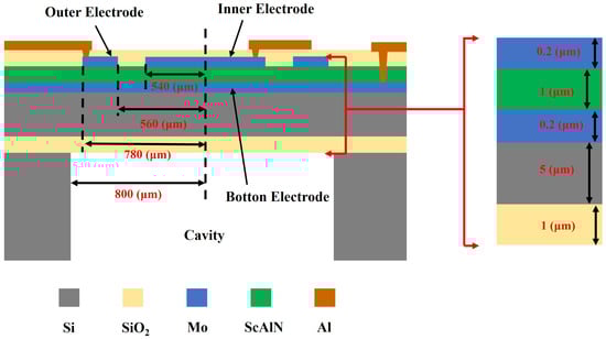 To optimize the performance of the PMUT, this study employs the finite element simulation software COMSOL Multiphysics 6.1 for modeling. In the simulation, the cavity radius was fixed, and only a single top electrode was used while keeping all other parameters unchanged []. A parametric sweep was performed on the radius of the top electrode, and the results are shown in Figure 3. Through comparative analysis, the optimal ratio between the top electrode radius and the cavity radius was determined. When designing a PMUT with a differential electrode configuration, the rationality of electrode distribution was taken into consideration. Accordingly, the IE radius was set to 540 µm, and the outer electrode width was set to 220 µm with a 20 µm gap between them. The geometric structure and parameters of the PMUT are illustrated in Figure 4.