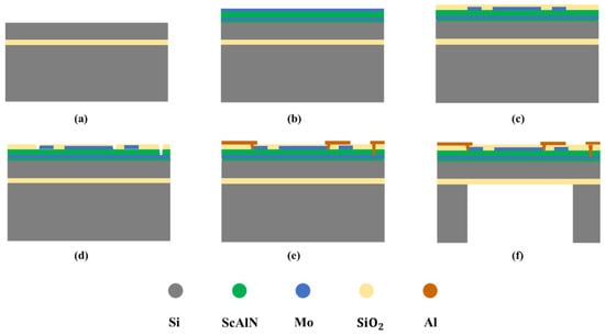 The complete MEMS manufacturing process used in this study is shown in Figure 5. The process starts with the preparation of a single-side polished SOI wafer (Figure 5a). As illustrated in Figure 5b, a 50 nm ScAlN seed layer with 9.6% doping was deposited via Physical Vapor Deposition (PVD), which was followed by the deposition of a 0.2 µm Mo bottom electrode layer, a 1 µm ScAlN piezoelectric layer, and a 0.2 µm Mo top electrode layer. As shown in Figure 5c, the top electrode was etched using reactive ion etching (RIE), and after patterning the top electrode, an oxide insulating layer () was deposited via Plasma-Enhanced Chemical Vapor Deposition (PECVD). As depicted in Figure 5d, electrode vias were etched using RIE to facilitate connections between the top and bottom electrodes. As illustrated in Figure 5e, Al aluminum electrodes were deposited via PVD and patterned to form electrical interconnects. In the final step (Figure 5f), the diaphragm is released by performing backside deep reactive ion etching (DRIE) of the SOI wafer to form the cavity structure.
