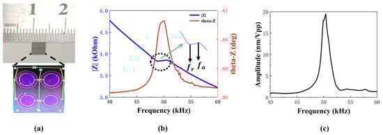 (a) Optical images of PMUT array. (b) Electrical properties of PMUT array. (c) Measurement of the PMUT array’s frequency response using LDV.