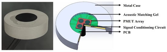 The sensing module comprises a PMUT array, a preamplifier, an acoustic matching gel, a 316L stainless steel housing, and an electronic packaging adhesive. The encapsulated sensing module is shown in Figure 7; the top layer consists of an acoustic matching gel (polyurethane) for impedance coupling, followed by the PMUT array and signal conditioning circuit in the middle, while the bottom layer uses a silicone potting compound for electronic encapsulation and mechanical fixation. The selection of acoustic matching gel plays a decisive role in the encapsulation design of the sensing module, as its performance directly impacts both the acquisition quality of bowel sounds and system reliability. When detecting bowel sounds, the packaging material must simultaneously meet dual requirements of acoustic performance and physical protection: it must achieve precise acoustic impedance matching (typically within 1.5–1.7 MRayl) to ensure efficient signal transmission from biological tissues to the sensor while minimizing signal reflection and energy loss caused by acoustic impedance mismatch at media interfaces, while also providing excellent sealing properties to prevent bodily fluid infiltration and external interference, along with good biocompatibility for long-term wearable or implantable applications. The acoustic transmission coefficient (T) at the material interface can be calculated using Equation (6) []: