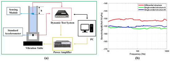 This study implemented three distinct signal readout configurations based on the signal conditioning circuit: differential structure, single-ended structure A, and single-ended structure B. In the differential structure, the signal conditioning circuit is connected to both the IE and OE, while the bottom electrode is grounded. In single-ended structure A, the bottom electrode and OE are connected to the signal conditioning circuit with the IE left floating. In single-ended structure B, the bottom electrode and IE are connected to the signal conditioning circuit, while the OE remains floating. This work evaluated the sensing module’s sensitivity using the experimental configuration illustrated in Figure 8a. The sensing module under test was first fixed at a predetermined height h above the liquid surface. Subsequently, the acceleration and frequency of the vibration signal were set, and the vibration signal was amplified by a power amplifier before being output to the shaker. At the last stage, the sensing module transmits the electrical signal to the dynamic test system. The sensitivity () of the sensing module was calculated using Equation (7) []: