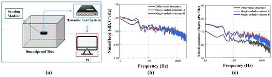 Figure 9a shows the experimental setup used to measure the baseline noise levels for all readout configurations. The measurements were conducted in an anechoic chamber (Figure 9b), and all three readout configurations exhibited comparable noise floor levels. According to Equation (8) and Figure 9c, the differential PMUT structure achieved a noise resolution of 62.89 dB at 500 Hz, while the single-ended PMUT structures A and B demonstrated noise resolutions of 68.45 dB and 67.18 dB, respectively, at the same frequency. Consequently, the differential PMUT structure exhibits lower noise gain compared to the single-ended PMUT structures. Taking into account both sensitivity and noise resolution, this study ultimately selected the differential structure as the signal readout configuration for the PMUT.