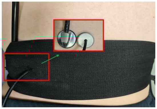 In order to test the performance of the defecation warning monitor, we compared a modified stethoscope with the defecation warning monitor. The modified stethoscope was developed by integrating an electret condenser microphone module into the traditional stethoscope structure with the microphone module embedded in the rubber sound tube of the stethoscope. Three healthy adult male volunteers (A, B, and C) participated in this study. The experiment is divided into two stages: the first stage is to monitor the subjects continuously for 4 min when they have the urge to defecate and then rest for 60 min after defecation. The second stage includes continuous monitoring for 16 min under non-defecation impulse conditions. The collected data are processed over a 4-min period. Before the experiment, the designed sensing module and modified stethoscope were tightly attached to the abdominal wall of the human body and fixed, as shown in Figure 10. Throughout the experiment, subjects maintained a supine position while minimizing the generation of noise.