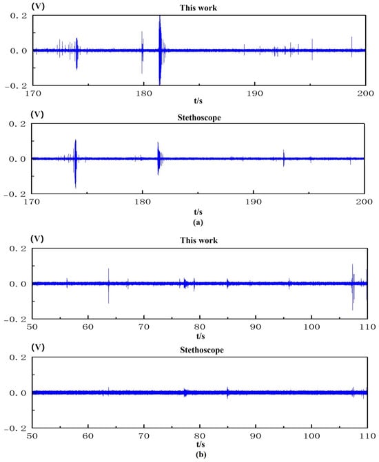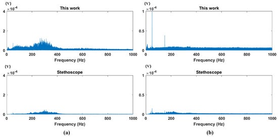 Figure 11a,b present the bowel sound monitoring results obtained by the proposed monitoring device and the modified stethoscope under defecation-urge and non-urge conditions, respectively. This study employed a controlled experimental design to systematically compare the performance differences in bowel sound acquisition between the PMUT-based defecation warning monitor and the modified stethoscope. The experimental data clearly demonstrate that the PMUT-based defecation warning monitor exhibits significant superiority in time-domain signal acquisition capabilities. As shown in Figure 11, its outstanding high-sensitivity characteristics enable the precise detection and recording of more low-intensity bowel sound signals. Spectral analysis results (Figure 12a,b) reveal that the bowel sound signals exhibit distinctive frequency-domain characteristics with their core frequency components predominantly concentrated in the specific range of 100–500 Hz. This spectral feature shows remarkable consistency with previously reported bowel sound frequency characteristics by Ranta et al. [], further validating the stability of acoustical signals generated by intestinal motility in the frequency domain. These findings not only confirm the reliability of previous research but, more importantly, provide critical parameter references for the frequency-band optimization design of bowel sound monitoring devices.