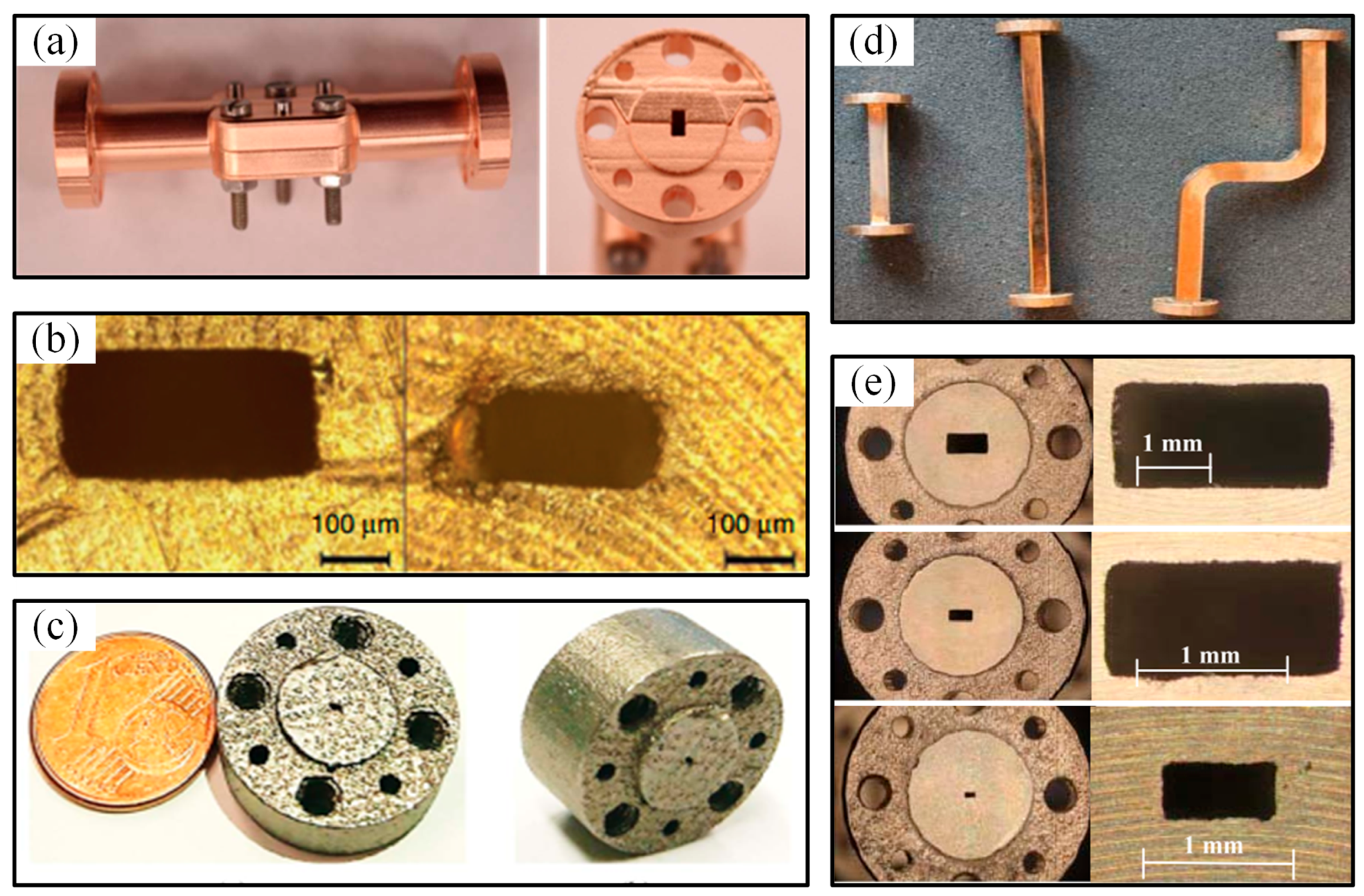 - Bi, X.; Meng, L. Research on Integral Fabrication and Inner Surface Metallization of the High-Frequency Terahertz Hollow-Core Metal Rectangular Waveguide Cavity by a Combined Process Based on Wire Electrochemical Micromachining and Electrochemical Deposition. Micromachines 2022, 13, 1346. [Google Scholar] [CrossRef]