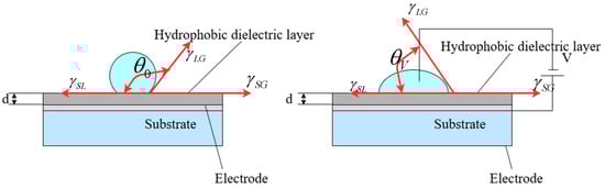 Figure 2. The three-phase contact angle after the applied voltage can be derived from the above two equations and is represented by the Lippmann–Young equation as follows: