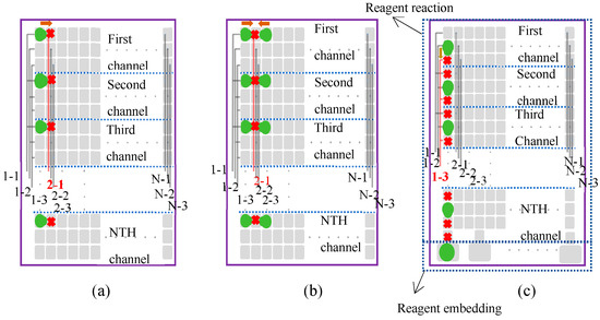 Specifically, the DMF chip includes both a reagent reaction and reagent embedding section. In the reagent embedding section, we can add the required reagents or droplets and then move them to the reagent reaction section for the necessary reactions. The typical design of the reagent reaction chip uses a 2 mm × 2 mm electrode as the minimum unit for droplet movement. The size of this electrode can be adjusted according to the specific application while meeting the processing requirements. Then, we arrange M single electrodes in parallel to form one row, creating a single row of M columns of electrodes. To ensure the free longitudinal movement of droplets within the channel, we must use K single rows of electrodes to form a sample movement channel, with the condition that K ≥ 3. Therefore, a sample channel is composed of a K-row and M-column electrode array. Next, if the number of samples to be processed in the actual application is N, we design N sample channels, each consisting of K rows and M columns of electrodes, ultimately forming an N × K-row × M-column electrode matrix. Finally, for each channel, the electrodes in the k-th row (k ≤ K) and m-th column (m ≤ M) are connected in parallel with the corresponding electrodes in the same row and column of the other N − 1 channels, forming a parallel electrode drive. In this way, for the reagent reaction chip with an N × K-row × M-column electrode matrix, we only need K*M control lines for driving, and the number of control lines is independent of the number of channels, ensuring scalability for different applications. In